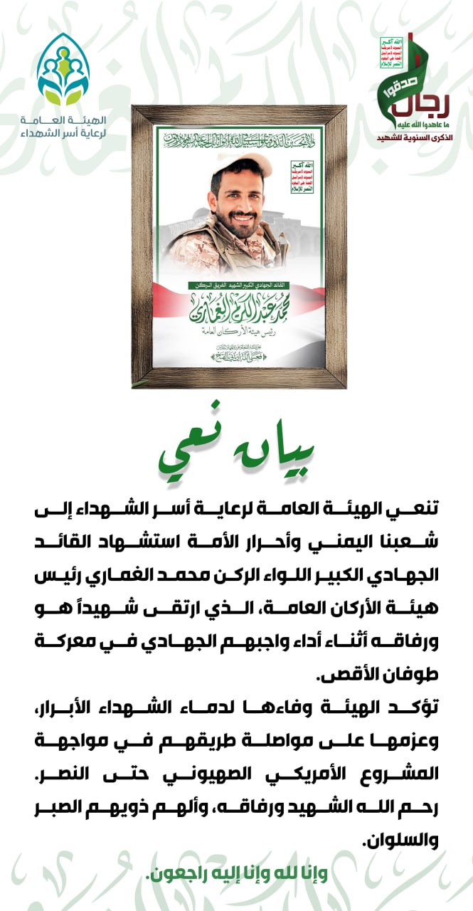 الهيئة العامة لرعاية أسر الشهداء تنعي استشهاد القائد الجهادي الكبير الفريق الركن محمد الغماري رئيس هيئة الأركان العامة.
