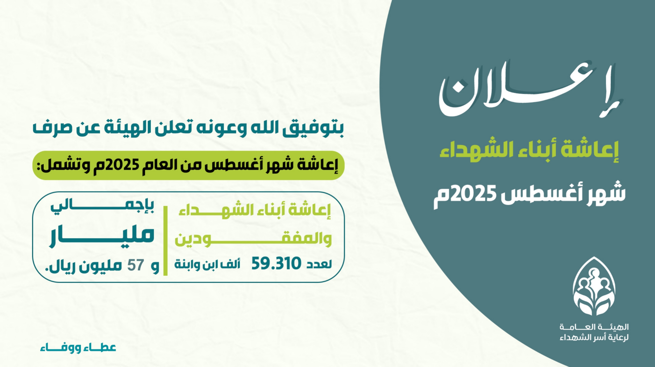 صرف إعاشة أبناء الشهداء والمفقودين لشهر أغسطس من العام 2025م بإجمالي مليار و57 مليون ريال