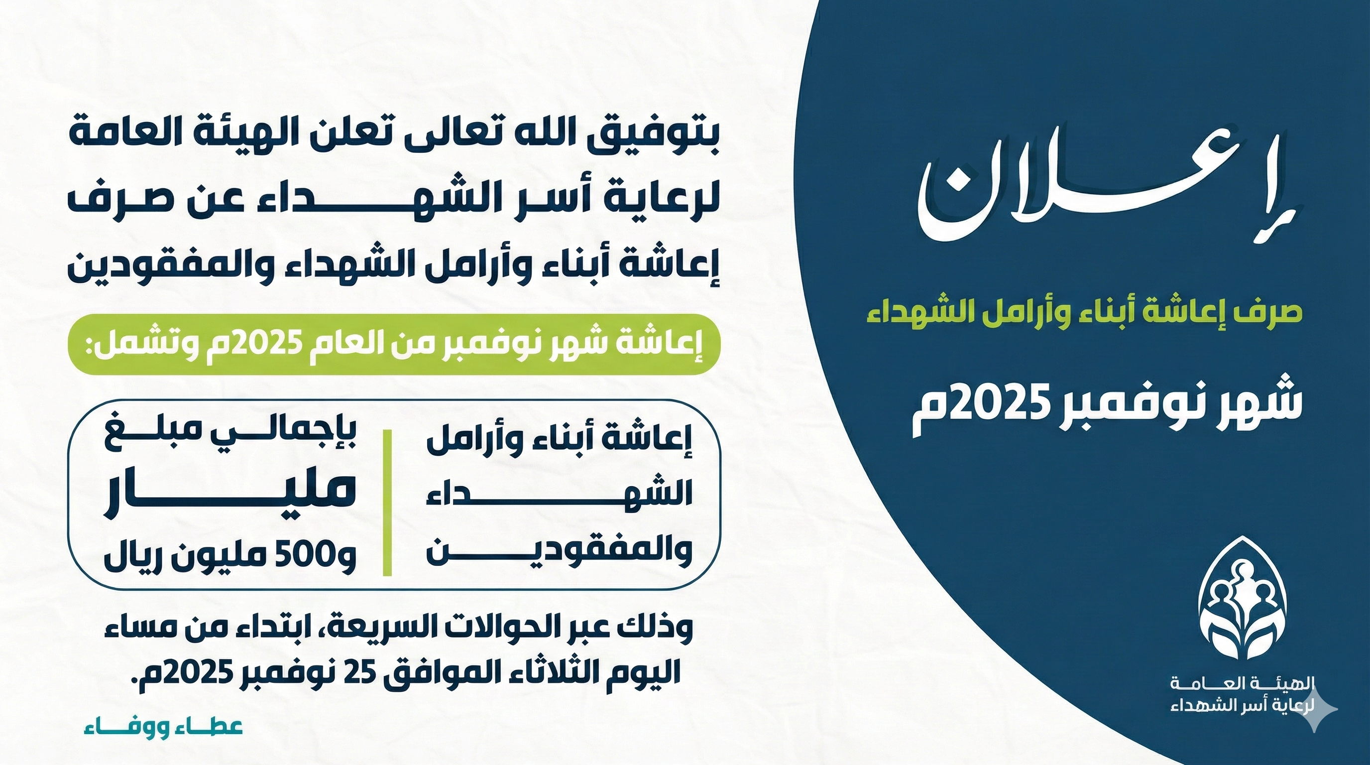 بإجمالي مليار و501 مليون ريال صرف إعاشة أبناء الشهداء والمفقودين وأرامل الشهداء وزوجات المفقودين لشهر نوفمبر من العام 2025م