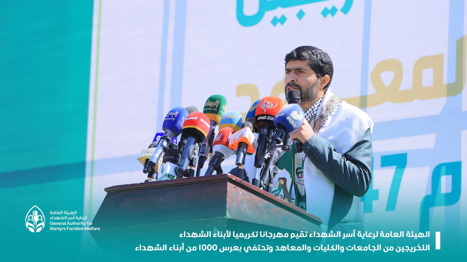في أجواء مفعمة بالوفاء والعزة والاعتزاز بتضحيات الشهداء، أقامت الهيئة العامة لرعاية أسر الشهداء اليوم في العاصمة صنعاء مهرجانًا تكريميًا مهيبًا لتكريم خريجي الجامعات والكليات والمعاهد وكلية الشرطة من أبناء الشهداء، والاحتفاء بزفاف ألف عريس من أبناء الشهداء للعام الهجري 1447هـ. شهد المهرجان حضورًا رسميًا وشعبيًا واسعًا تقدمه القائم بأعمال رئيس الوزراء العلامة محمد مفتاح، ووزيرا الصحة والبيئة الدكتور علي شيبان والتربية والتعليم والبحث العلمي الدكتور حسن الصعدي، إلى جانب عدد من نواب رئيسي مجلسي النواب والشورى، وقيادات الدولة وأسر الشهداء. افتتح رئيس الهيئة العامة لرعاية أسر الشهداء، طه أحمد جران، المهرجان بكلمة ترحيبية، وجه فيها تحية الإعزاز والافتخار لأبناء وأسر الشهداء. وأشار جران إلى أن هذا المهرجان يأتي تتويجًا لفعاليات الذكرى السنوية للشهيد. وأوضح رئيس الهيئة أن التكريم يشمل أبناء الشهداء الذين تخرجوا خلال الأعوام الثلاثة الممتدة من 1444هـ حتى 1446هـ، احتفاءً بتفوقهم وجني ثمرة جهودهم، كما أكد أن الهيئة تحتفي أيضًا بكوكبة من الشباب العرسان من أبناء الشهداء الذين أتموا نصف دينهم وتزوجوا مؤخرًا والمقبلون على ذلك. وخاطب جران الخريجين قائلًا: "نشد على أيديكم أن تكونوا لبنات أساسية في بناء وطنكم وخدمة شعبكم في شتى مجالات تخصصاتكم"، وبارك للعرسان، متمنيًا لهم الصلاح والبركة. كما أكد أن الذكرى السنوية للشهيد محطة إلهام مهمة، مشيرًا إلى أن ما تنعم به اليمن من حرية واستقلال وجيش مؤمن ورفض للوصاية هو شاهد حي على قيمة الشهادة وأهميتها وعطاء الشهداء العظماء وأثره. من جانبه، أشاد القائم بأعمال رئيس مجلس الوزراء العلامة محمد مفتاح بجهود قيادة الهيئة في تنظيم هذا الحدث الوطني، معتبرًا أن تكريم أبناء الشهداء هو وفاء لدماء الآباء وتقدير لصمود الأسر التي قدمت أروع صور الإيثار والثبات. وقال مفتاح في كلمته: "إن أبناء الشهداء هم الامتداد الطبيعي لمسيرة التضحية والبذل، وسيظلون نموذجًا يُحتذى في الصبر والعطاء وحمل راية الحق"، مؤكدًا أن رعاية أسر الشهداء واجب وطني وديني وإنساني تسعى الدولة جاهدة للقيام به رغم التحديات. كما ألقى فؤاد سبحان كلمةً نيابة عن أبناء الشهداء، عبّر فيها عن شكرهم وامتنانهم للهيئة العامة على اهتمامها المستمر، مجددًا العهد بالسير على خطى الآباء الشهداء في خدمة الوطن والدفاع عن كرامته. وتخلل المهرجان أوبريت إنشادي لفرقة أنصار الله وفيديو كليب بعنوان "الشعب المعطاء" جسّد معاني الفداء والعطاء، واختُتم الحفل بتكريم الخريجين وتوزيع الدروع التقديرية تقديرًا لإنجازاتهم وتحفيزًا لهم على مواصلة مسيرة النجاح والعطاء.