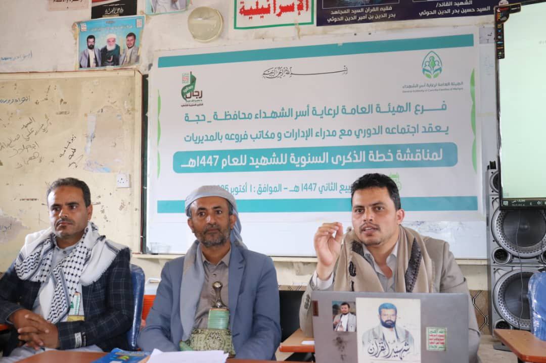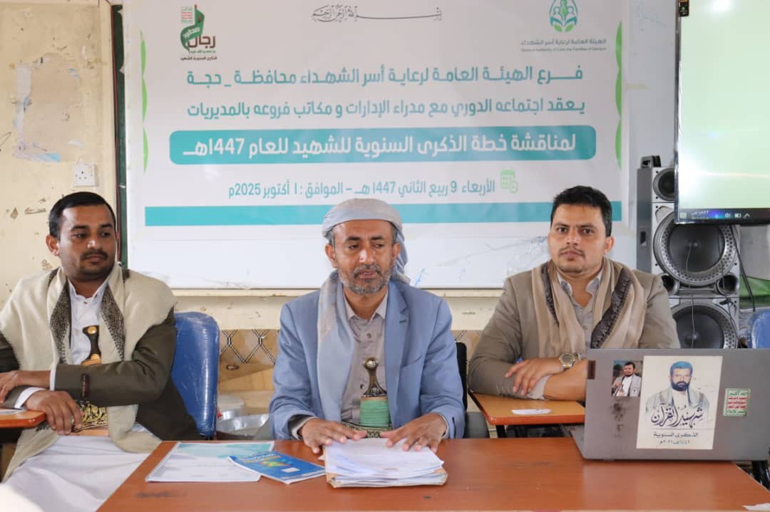 عقد فرع الهيئة العامة لرعاية أسر الشهداء بمحافظة حجة، اليوم الأربعاء، اجتماعًا دوريًا مع مدراء الإدارات ومكاتب الفروع بالمديريات، لمناقشة خطة إحياء الذكرى السنوية للشهيد للعام 1447هـ. الجسم: وخلال الاجتماع، ألقى مدير عام الفرع الأستاذ مطهر صفي الدين كلمة رحّب فيها بالحاضرين، مشددًا على أهمية استكمال الترتيبات الخاصة بالذكرى السنوية، والعمل بروح الفريق الواحد لإبراز المناسبة بما يليق بتضحيات الشهداء ومكانتهم العظيمة. واستعرض الحاضرون مخرجات الاجتماع السابق، وناقشوا عددًا من القضايا والمحاور، أبرزها آليات وأدبيات الزيارات الميدانية ونماذج الهدايا الخاصة بالذكرى الأعمال الفنية لروضات الشهداء، بما في ذلك أعمال التسوير والتشجير وتجهيز الصور مشروع البيانات والمعلومات، والتأكيد على استكمال المسح الميداني والتحقق من بيانات أسر الشهداء في السجل الشامل، بما يشمل الشهداء المدنيين. وأكد المجتمعون في ختام اللقاء حرصهم على مواصلة الاهتمام بأسر الشهداء، وتقديم أوجه الرعاية والدعم التي تليق بمكانتهم، وفاءً لتضحياتهم العظيمة التي سطرت أسمى معاني البذل والعطاء.