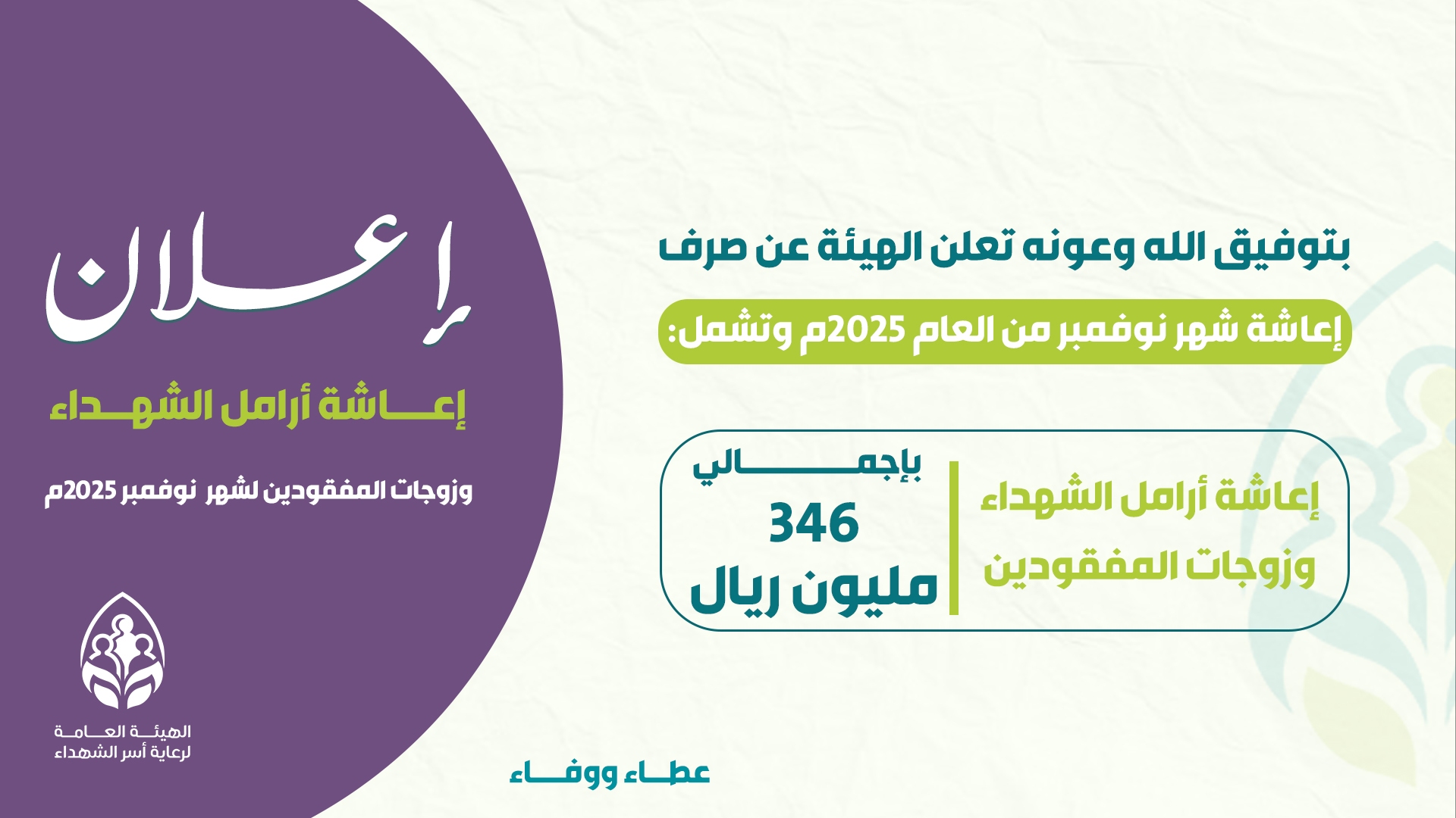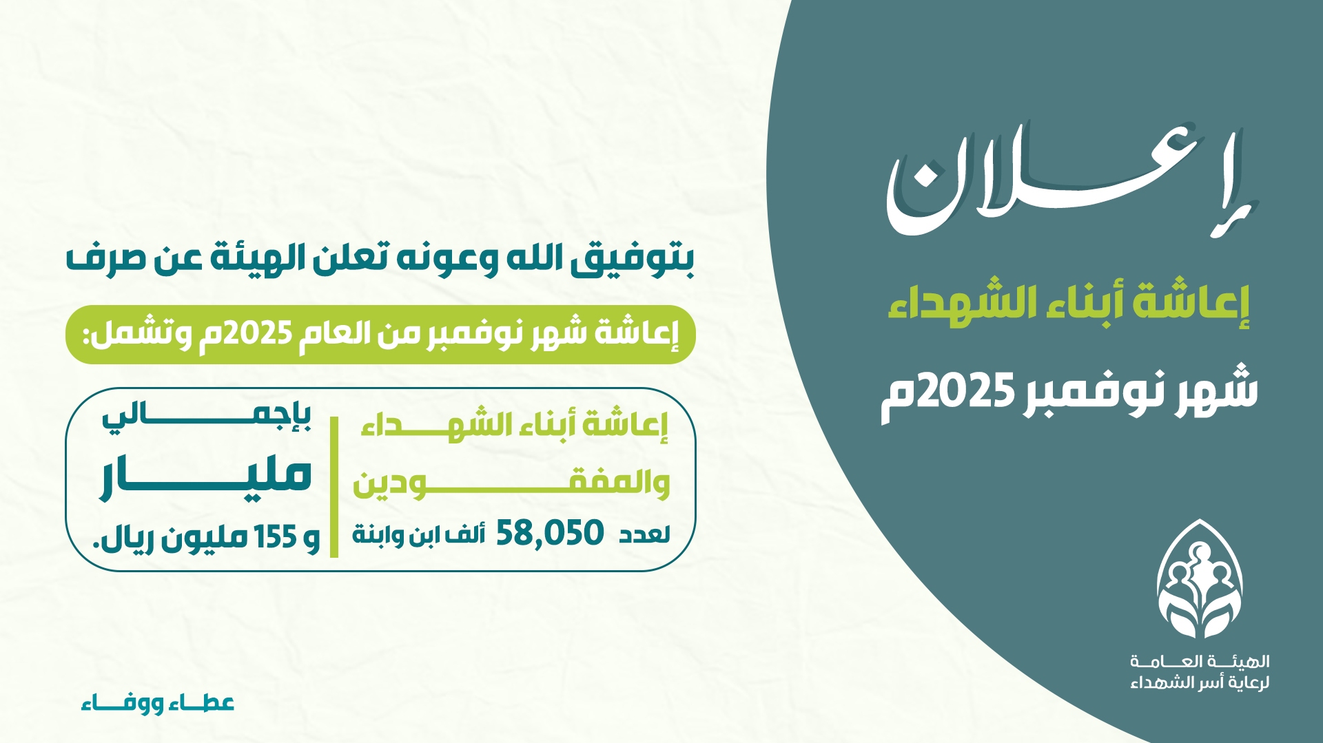 أعلنت الهيئة العامة لرعاية أسر الشهداء اليوم الثلاثاء عن صرف إعاشة شهر نوفمبر من العام الجاري 2025م(كفالة) أبناء الشهداء والمفقودين لعدد 58.050 ابن وابنة بإجمالي مليار و155مليون ريال، بالإضافة إلى إعاشة الأرامل وزوجات المفقودين بإجمالي 346مليون ريال ليبلغ إجمالي مشروع إعاشة أبناء الشهداء والمفقودين وأرامل الشهداء وزوجات المفقودين لشهر نوفمبر مليار و501مليون ريال. وتنوه الهيئة أن عملية الصرف بدأت مساء اليوم الثلاثاء 25 نوفمبر 2025م، وذلك عبر خدمة الحوالات السريعة في جميع المحافظات. ويعد مشروع إعاشة أبناء الشهداء والمفقودين وأرامل الشهداء وزوجات المفقودين من المشاريع الرعائية الشهرية المستمرة التي تنفذها الهيئة بهدف التخفيف من معانات تلك الأسر ،وتاتي هذه المشاريع في إطار جهود الهيئة في توفير الدعم والرعاية الشاملة لأسر الشهداء والمفقودين، وتعزيز دورها في رعايتهم وتلبية احتياجاتهم الأساسية.