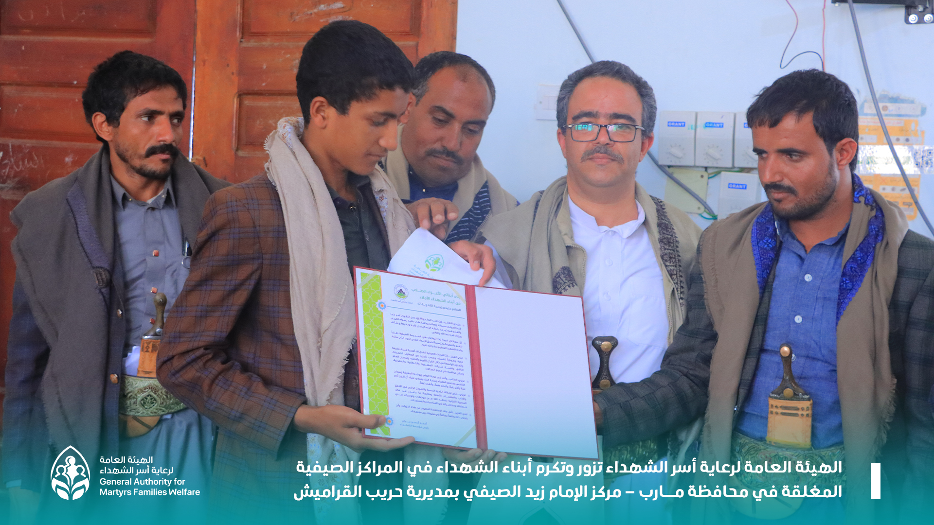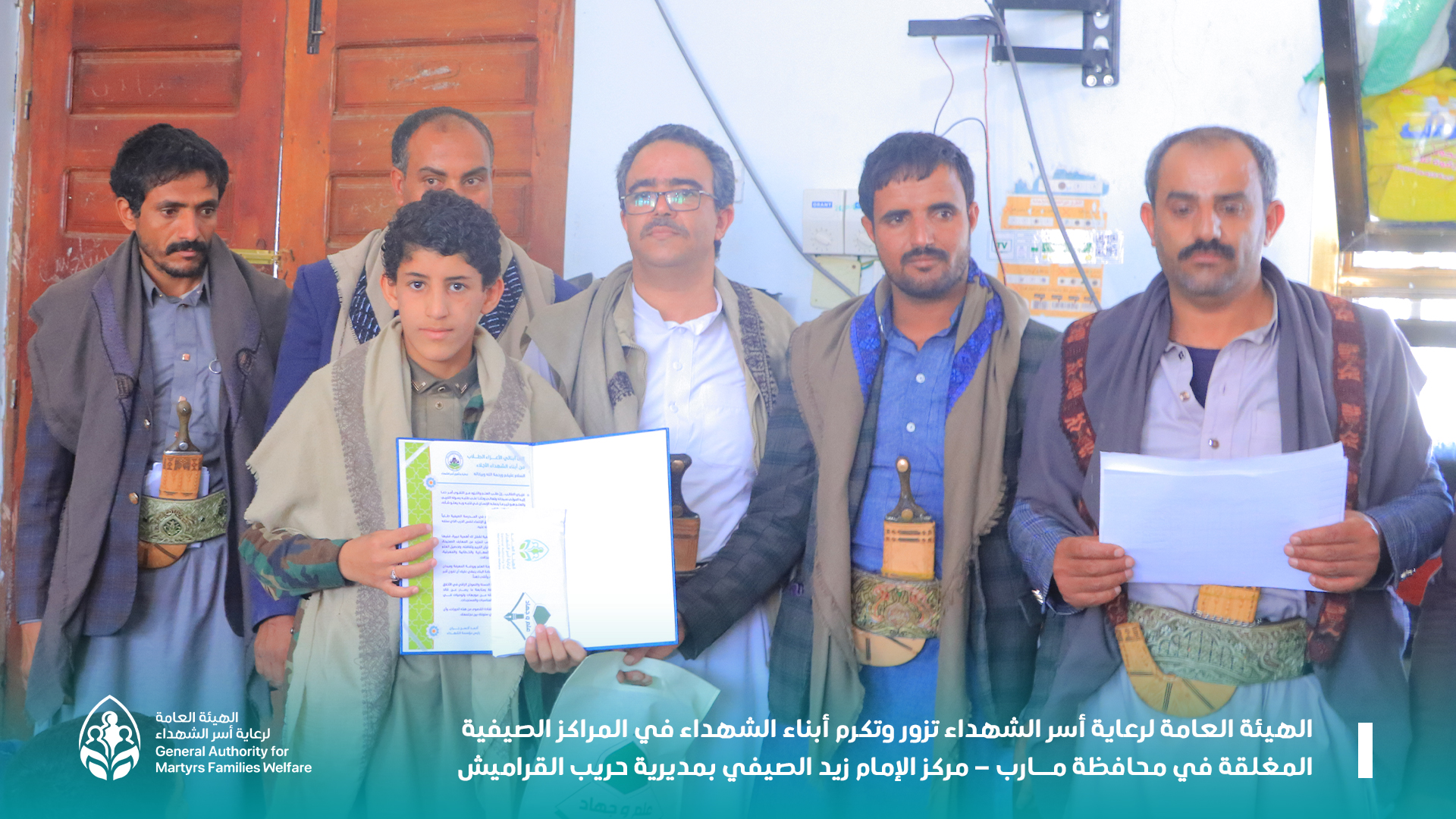 الهيئة العامة لرعاية أسر الشهداء تزور وتكرم أبناء الشهداء في المراكز الصيفية المغلقة في محافظة مارب في إطار الزيارات لأبناء الشهداء في المراكز الصيفية المغلقة، زار اليوم حسين الشيخ مدير عام الرعاية التربوية بالهيئة العامة لرعاية أسر الشهداء أبناء الشهداء في مركز الإمام زيد الصيفي بمديرية حريب القراميش في محافظة مارب. وفي كلمة الهيئة أكد الشيخ على تقديم الدعم الكبير لأبناء الشهداء وجعلهم في أولويات أنشطة الهيئة ومشاريعها... مشيرا عليهم بأن يكونوا القدوة الحسنة لزملائهم ومثالا يحتذى به في أوساط مجتمعهم. وفي الزيارة بحضور مدير فرع الهيئة بمحافظة مارب محمد علوان ونائب مدير مكتب التربية والتعليم ومدير عام مكتب الإرشاد علي حُميد ومدير مكتب الثقافة بمديرية حريب القراميش نضال حميد، عبر حسين الشيخ عن فخره بأبناء الشهداء وحرصهم على تواجدهم في المدارس الصيفية لطلب العلم النافع والمعرفة الصحيحة. من جانبهما مدير فرع الهيئة بمارب ومدير الرعاية الاجتماعية نايف الجابري رحبا بالزيارة الكريمة لأبناء الشهداء في مركز الإمام زيد الصيفي.. مثمنين جهود قيادة الهيئة في رعايتها لأسر الشهداء وأبنائهم واهتمامها بهم فكريًا وماديًا لتنشئتهم التنشئة الصالحة. هذا وكرم فريق الزيارة أبناء الشهداء في المركز بمبالغ مالية وهدايا رمزية..مؤكدًا استمرار الهيئة في الاهتمام بأبناء الشهداء تربويا وعلميا وفي جميع الجوانب. وبدورهم عبر أبناء الشهداء عن امتنانهم وشكرهم للهيئة العامة لرعاية أسر الشهداء على زيارتها الكريمة وتكريمها الرمزي لهم..مجددين العهد والولاء والوفاء للسيد القائد ولدماء آبائهم الشهداء والسير على نهجهم ومواصلة الدرب على خطى آبائهم العظماء.